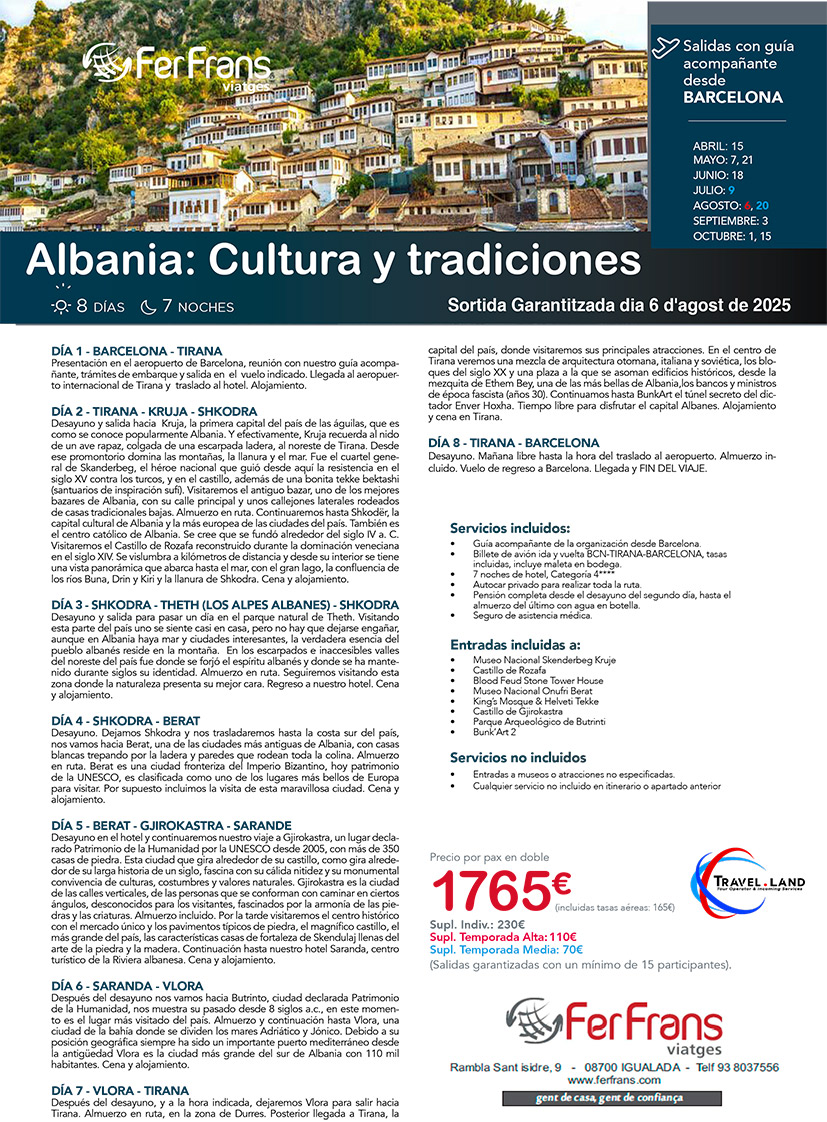 ALBÀNIA Del 6 al 13 d'agost de 2025 Viatge de 8 dies + Guia acompanyant + Pensió Completa i Totes les visites Veure PDF 1.765 €