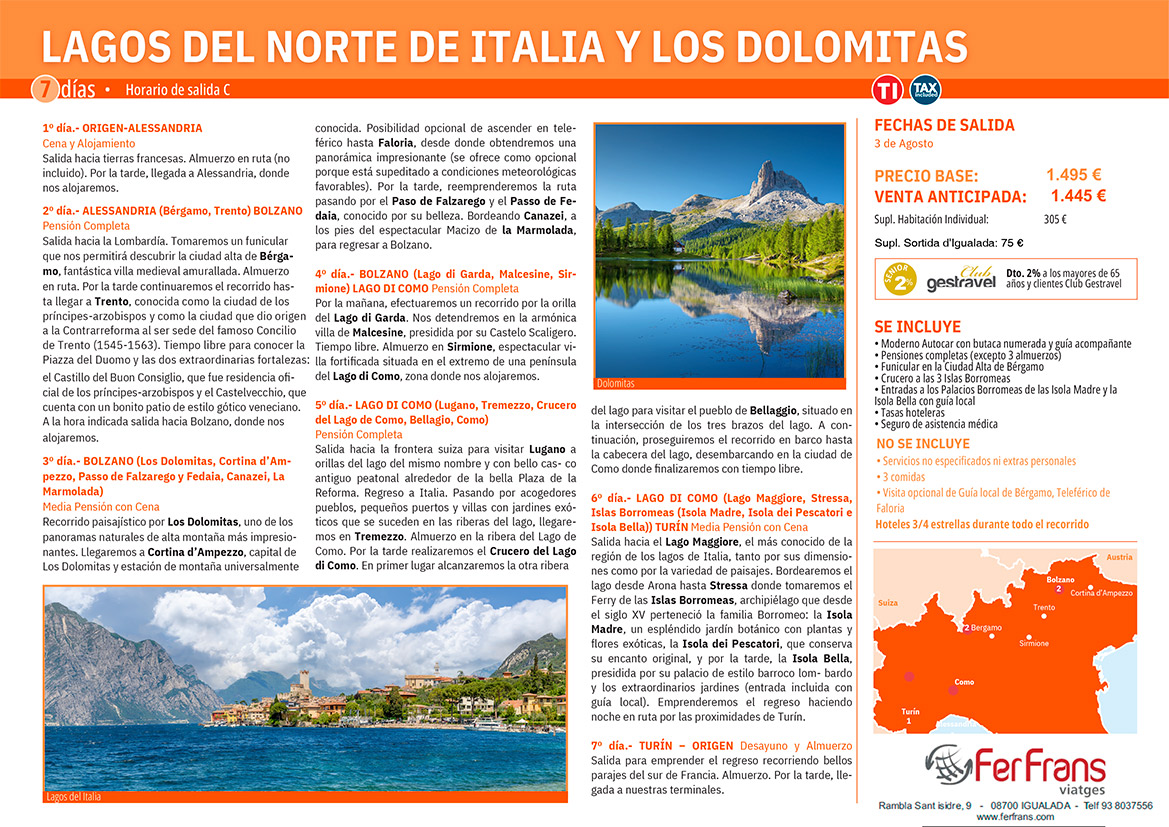 LLACS NORD D’ITÀLIA I DOLOMITES Del 3 al 9 d'agost de 2025 Viatge de 7 dies en autocar + Guia acompanyant n+ Pensió Completa + Totes les visites Veure PDF 1.495 €