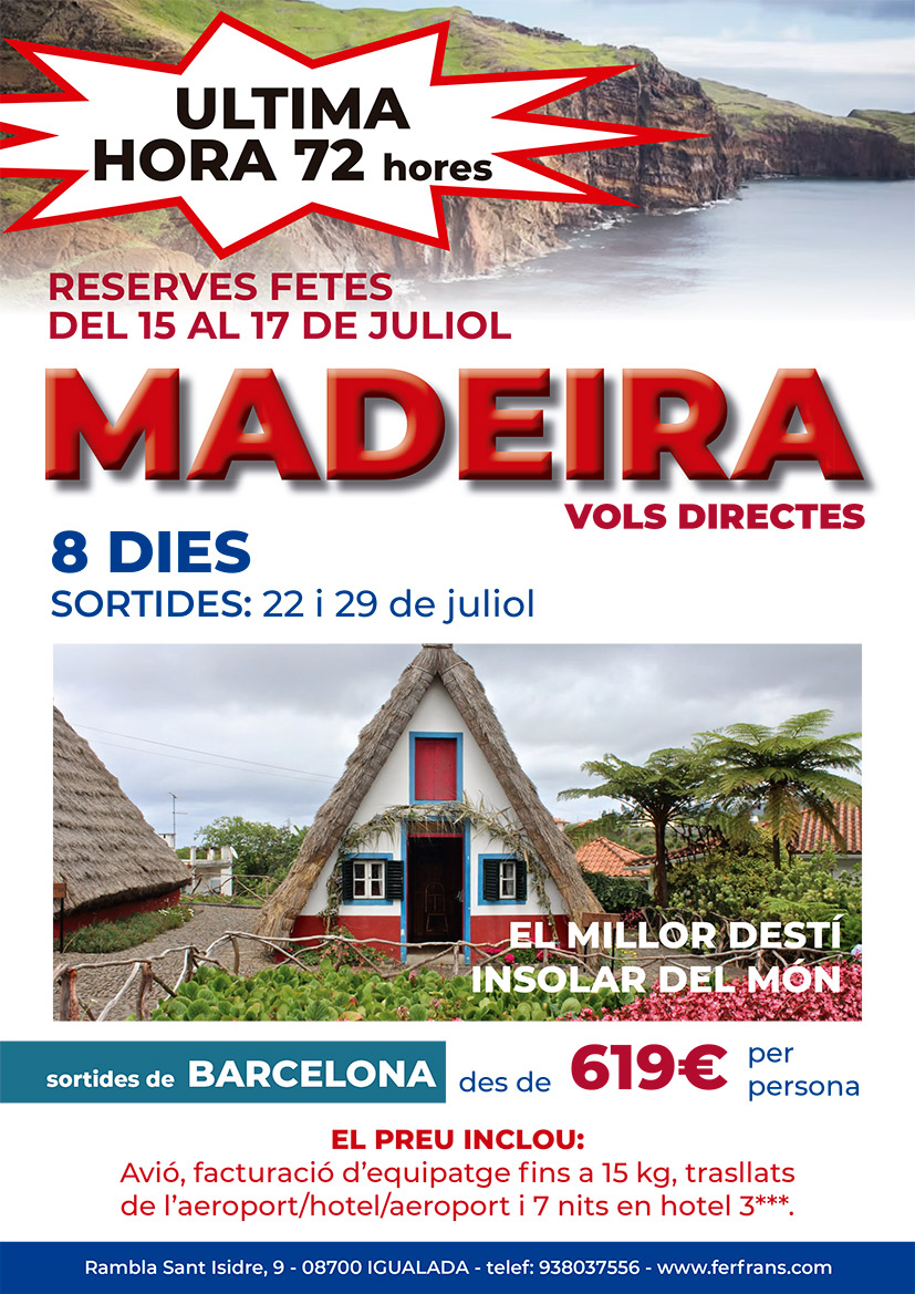 MADEIRA ¡¡ Última hora !!! Sortides: dies 22 i 29 de juliol Avió, facturació d’equipatge fi ns a 15 kg, trasllats de l’aeroport/hotel/aeroport i 7 nits en hotel 3***. Veure PDF des de 619 €