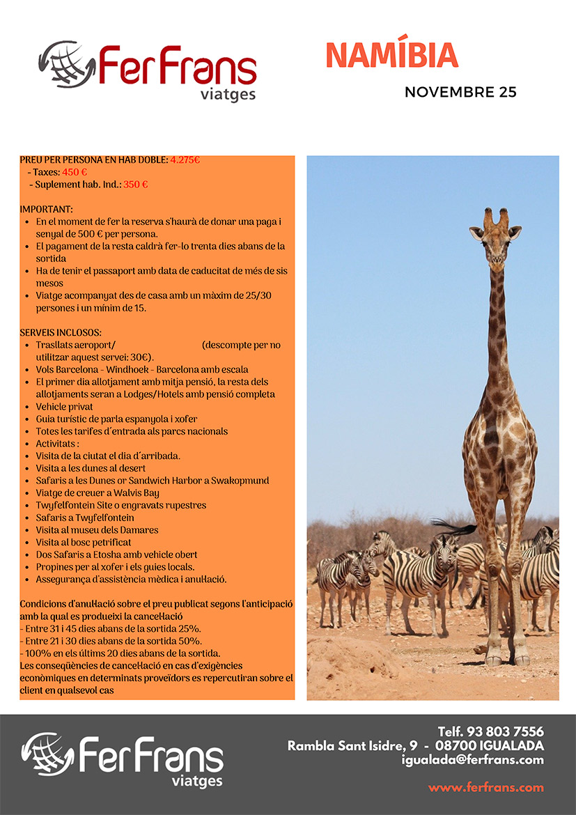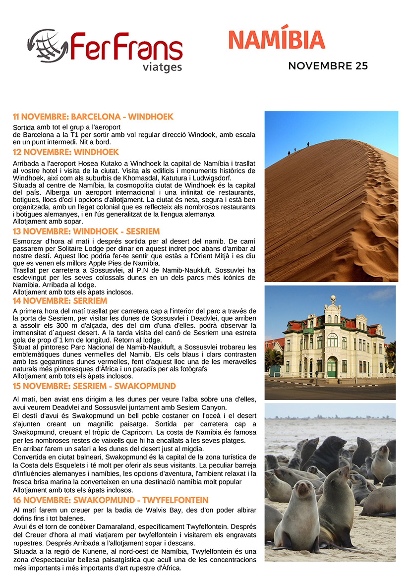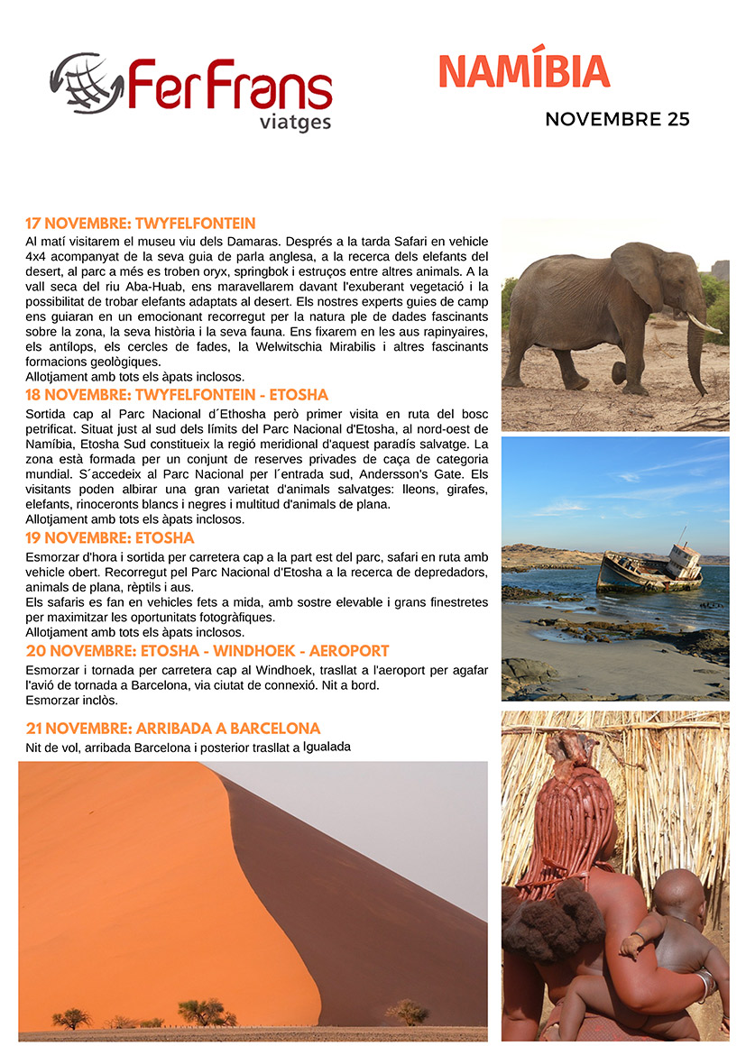 NAMÍBIA De l'11 al 21 de novembre de 2025 11 dies de viatge amb Grup Reduït + Guia acompanyant + Pensió Completa + Totes les visites Veure PDF 4.725 €
