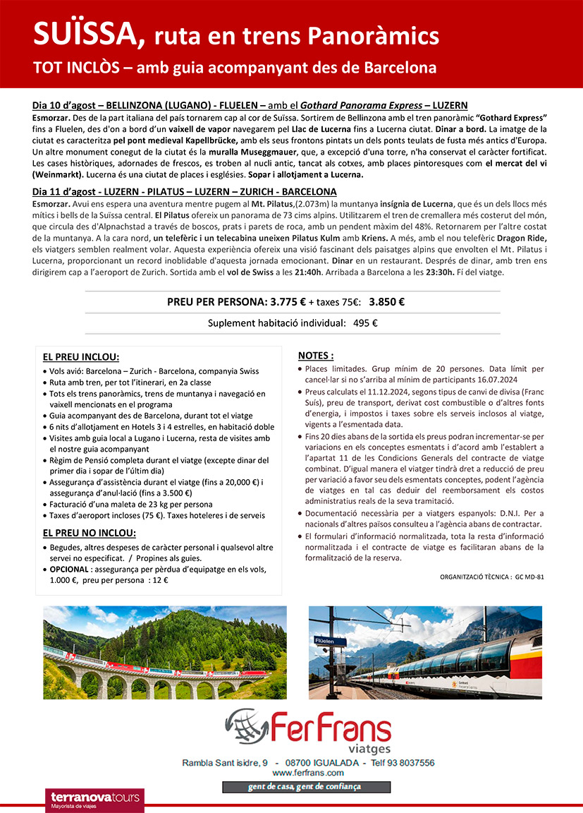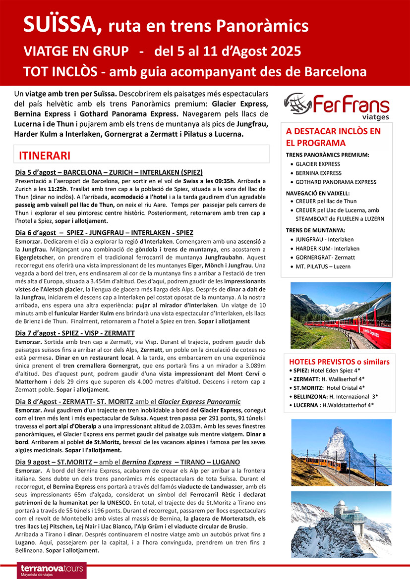 SUÏSSA, Trens Panoràmics Del 5 a l'11 d'agost de 2025 Viatge 7 dies amb Grup Reduït + Guia Acompanyant + Pensió Completa + Totes les Visites Veure PDF 3.850 €